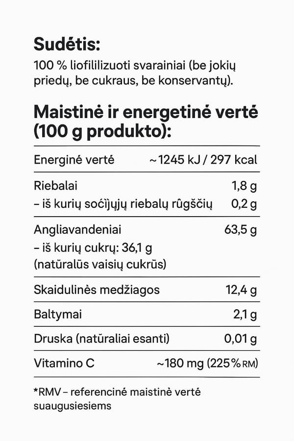 100 % liofilizuoti svarainiai (be jokių priedų, be cukraus, be konservantų).